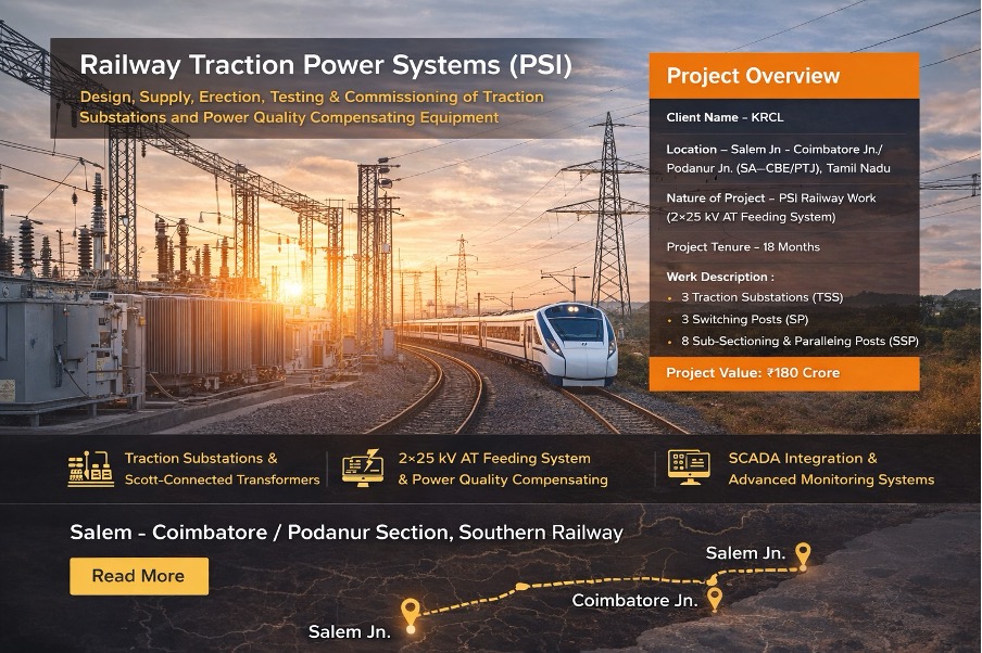 Multi Infra is executing the Design, Supply, Erection, Testing & Commissioning of Traction Substations (Scott-Connected) along with power quality compensating equipment, Switching Posts (SP), Sub-Sectioning Posts (SSP), and SCADA systems for the 2×25 kV AT feeding system on the Salem Junction – Coimbatore Junction / Podanur Junction section of the Salem Division, Southern Railway.